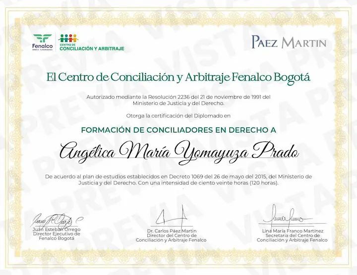 Abogada de la Universidad la Gran Colombia, con una excelente base de estudios en resolución de conflictos, Justicia Constitucional e Investigación Criminal, lo cual me permite estar bien equipada para manejar las complejidades de los conflictos. Además, el Diplomado de Conciliación brinda habilidades esenciales para facilitar el diálogo y encontrar soluciones pacíficas, lo cual es invaluable en la práctica legal del ejercicio de la conciliación.