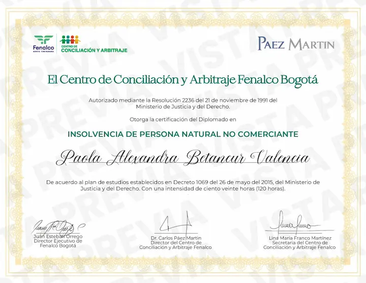 Abogada consultora, litigante y exfuncionaria de la rama judicial, Conciliadora en Derecho, Conciliadora/Operadora en Insolvencia económica de persona natural no comerciante, en ejercicio profesional independiente con buen crédito y excelente desempeño.