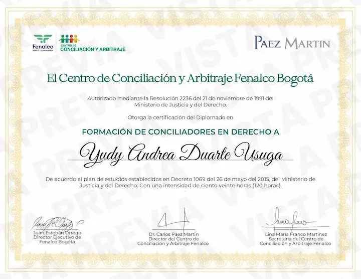 Abogada graduada de la universidad Autónoma Latinoamericana (UNAULA), con un diplomado en Conciliación, que le brinda herramientas y aumenta competencias para abordar y resolver conflictos desde diferentes perspectivas como lo es la conciliación.