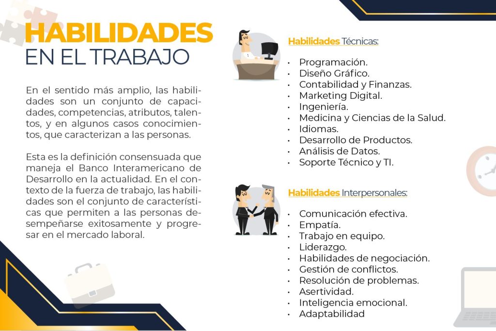 En el sentido más amplio, las habilidades son un conjunto de capacidades, competencias, atributos, talentos, y en algunos casos conocimientos, que caracterizan a las personas. Esta es la definición consensuada que maneja el Banco Interamericano de Desarrollo en la actualidad. En el contexto de la fuerza de trabajo, las habilidades son el conjunto de características que permiten a las personas desempeñarse exitosamente y progresar en el mercado laboral.