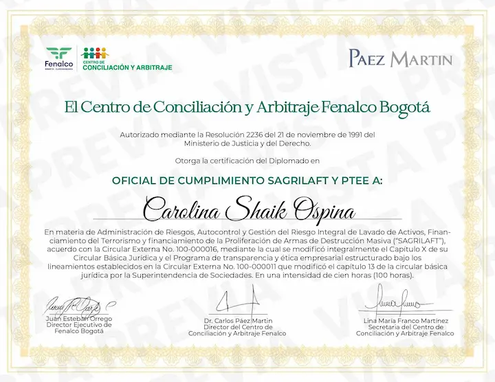 Abogada con formación sólida, ampliamente fundamentada en la ética y los valores, con capacidad de liderazgo y trabajo en equipo, proactiva y orientada al resultado. Con amplia experiencia como Oficial de Cumplimiento de SARLAFT, SAGRILAFT y PTEE, con conocimientos sólidos en derecho civil, comercial y laboral, y experiencia en elaboración, revisión y control de contratos civiles, comerciales, estatales, estructuración de conceptos jurídicos, atención de tutelas y derechos de petición.