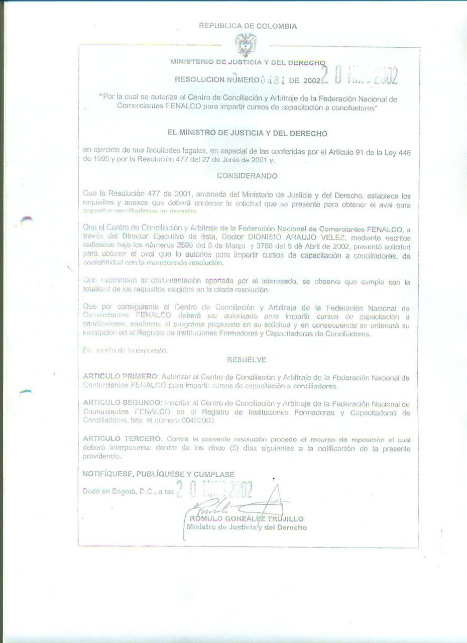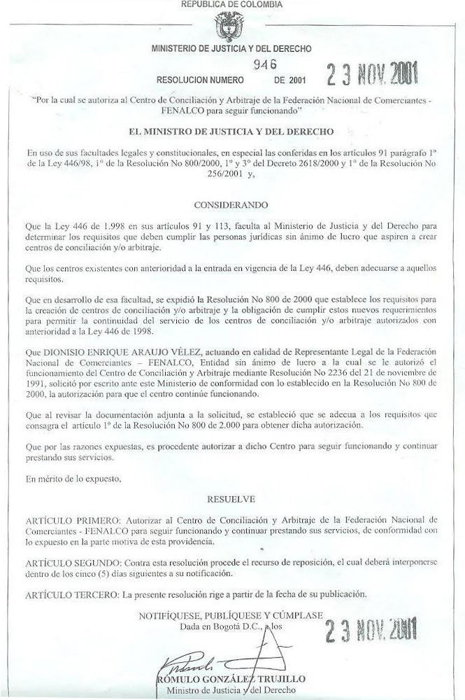Resolución autorización de funcionamiento Centro de Conciliación FENALCO